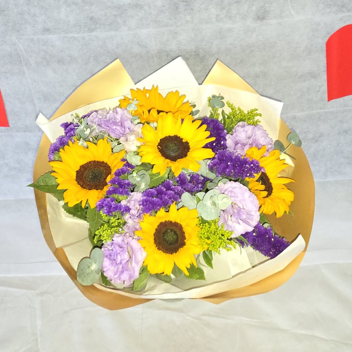 חמניות עם פרחים וענפי קישוט בגוון סגול. אלטרנטיבה מרשימה למי שמחפש משהו מיוחד וצבעוני